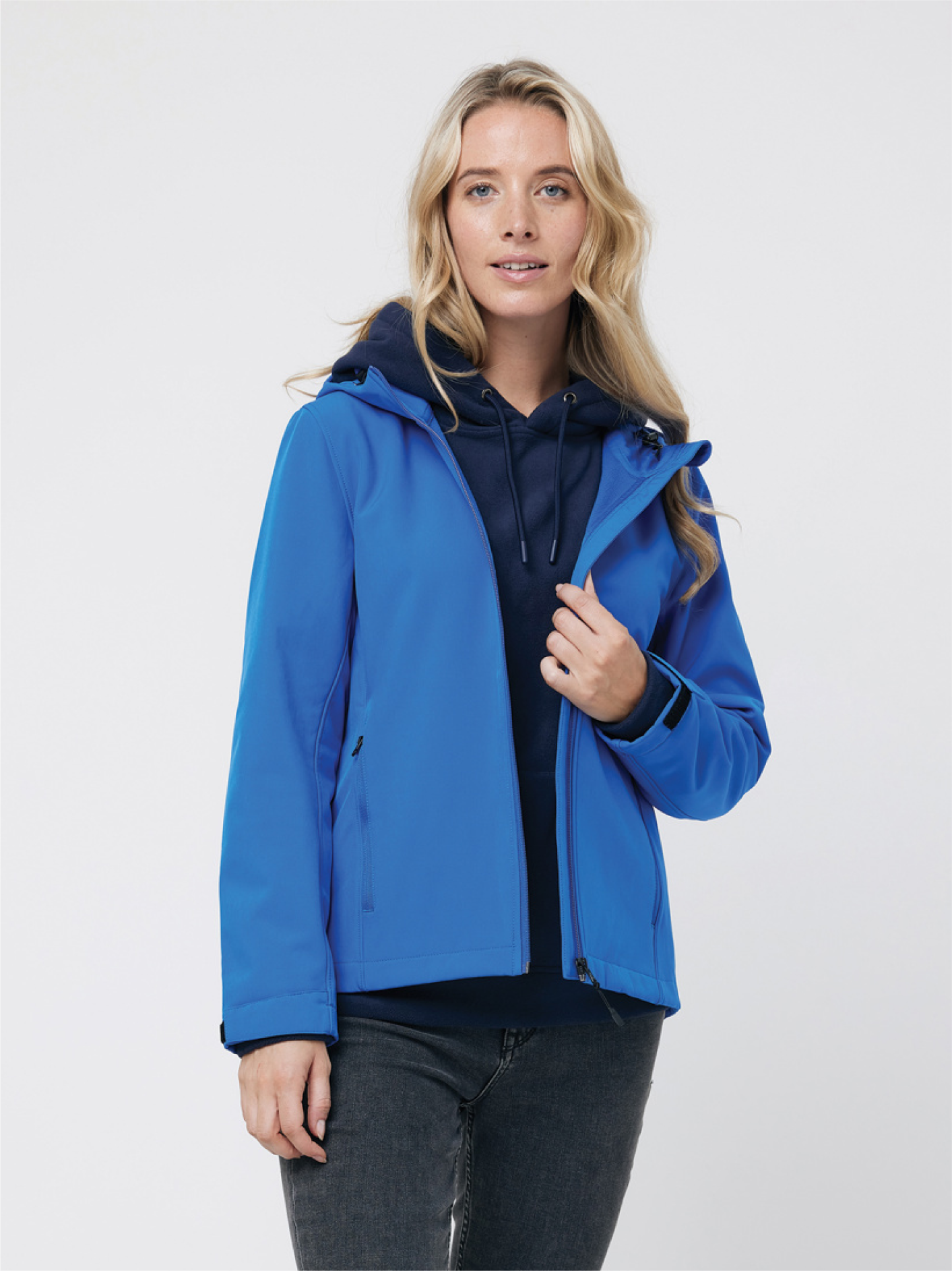 Dámská softshellová bunda středního střihu z recyklovaného polyesteru s 3vrstvou tkaninou (300 G/M²), recyklovanou TPU membránou a měkkým microfleecem uvnitř. Vodoodpudivá úprava bez fluorinu/PFAS.