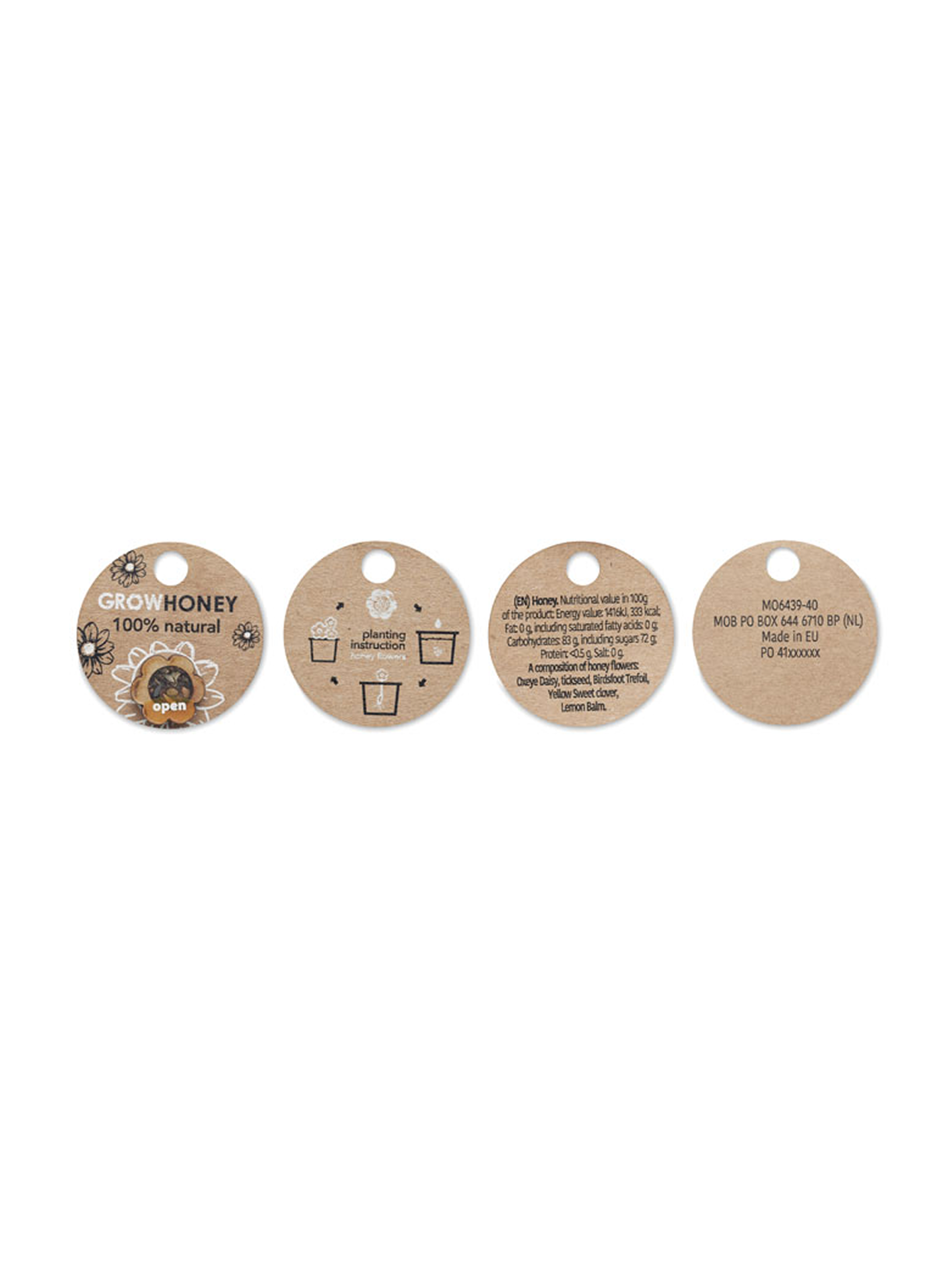 Sklenice s 50 g medu z divokých květů. Součástí jsou semínka včelích květů, která umožňují vypěstovat si vlastní květiny pro lákání včel. Vyrobeno v EU.